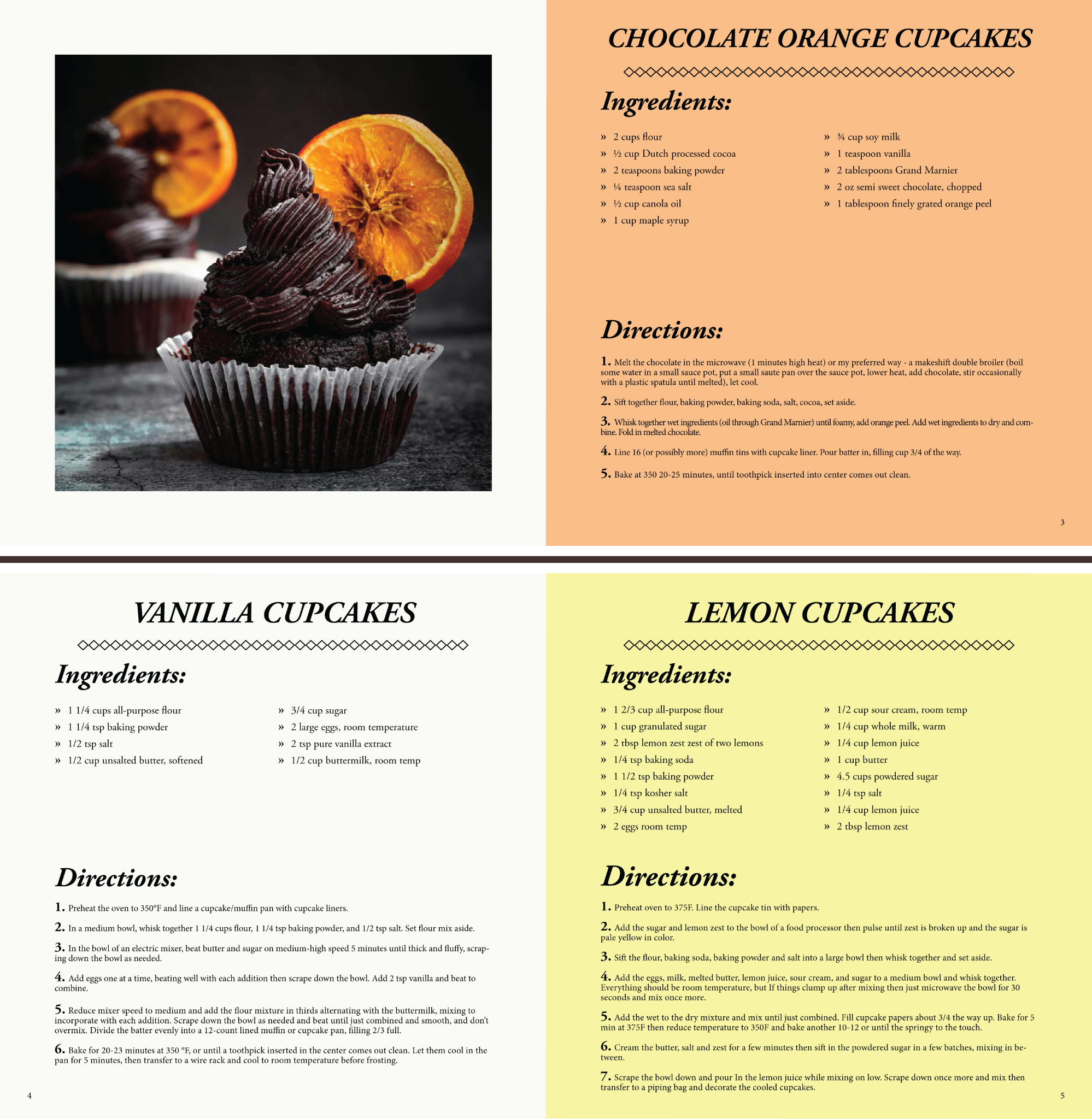 This is a recipe spread designed and laid out for a recipe Chocolate Orange, Vanilla, and Lemon Cupcakes.